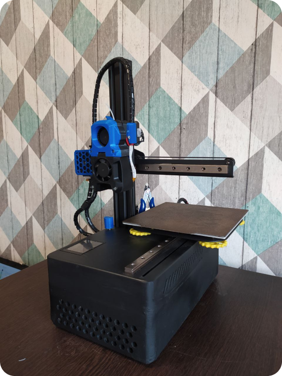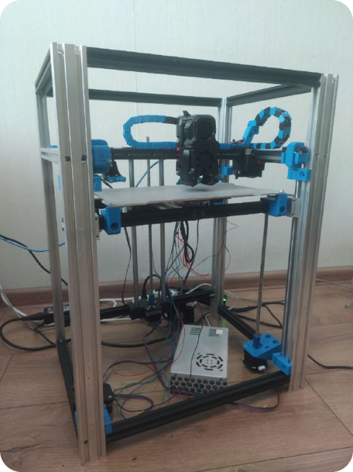 Скорость печати 120 мм/c ускорения 7000 мм/c, дистанционное полноценное управление принтером, изменение конфигурации, печать гибкими филаментами, печать композитными материалами, сложность ремонта - 5/10, максимальный кубический объём печати - 40 мм3